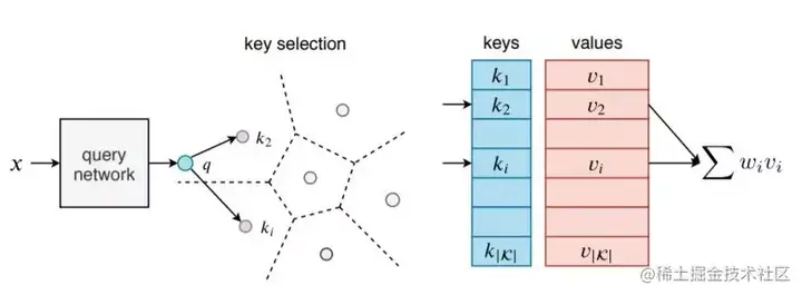 图 1:键值存储器层概述:输入 x 通过查询网络处理,该查询网络生成查询向量 q,将查询向量 q 与所有键进行比较。输出是与所选键相关的存储器的稀疏加权和。对于大量密钥 | K |,密钥选择过程在实践中成本过高。我们的 product key 方法是精确的,整个搜索过程非常快。