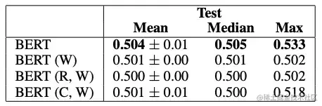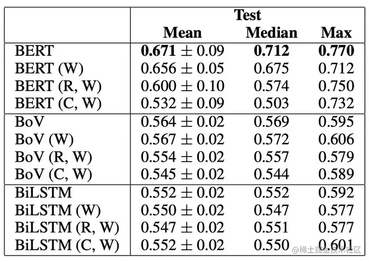 表 1:基线和 BERT 结果。我们的结果来自 20 个不同的随机种子(± 给出标准偏差)。BERT Large 的平均值受到 5/20 随机种子的影响而不能训练,这是 Devlin 等人提出的一个问题。因此,我们认为中位数是衡量 BERT 平均表现的更好指标。BERT(大)的非退化运行的平均值为 0.716±0.04。