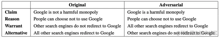 图 4 原始和对抗数据点。claim 被否定,warrant 被交换。W 和 A 的标签分配保持不变。