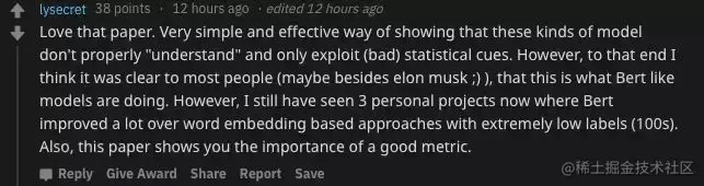 他认为这是一种非常简单而有效的方法来表明这类模型是不能正确地做到 “理解” 的,智能利用 (不好的) 统计线索。然而,对于大多数人 (除了埃隆・马斯克) 来说可能都会认为,像 BERT 这类模型的就是这么做的。