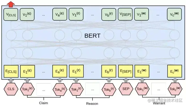 图 3:使用 BERT 处理参数一对 argument-warrant。reason(长度为 a 的单词)和 claim(长度 b)一起形构成第一句话,而 warrant(长度 c)是第二句。然后将最终的 CLS 矢量传递到线性层以计算 logit zj(i)。