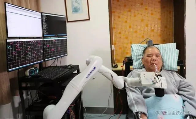 整个过程,从抓取可乐到准确的送到大爷嘴边,这一套流程都是大爷用意念控制机械臂完成的,既没动手也没动口。