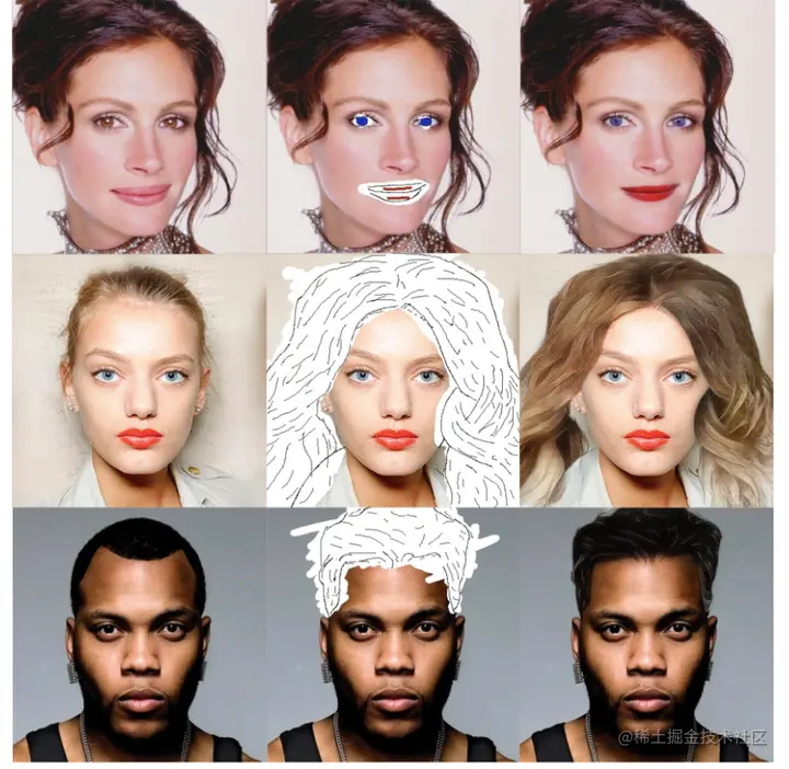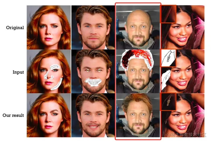我们先来看下效果,SC-FEGAN对人脸,尤其是眼睛和头发的编辑最为出色,只需几笔就让你重返青春。