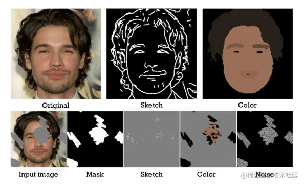 论文作者使用HED边缘检测器生成与用户输入相对应的草图。然后使用GFC对面部进行分割,用中间颜色表示分割部分,最后加上噪声表示作为输入,就得到了真实标准(上)和输入数据(下)。