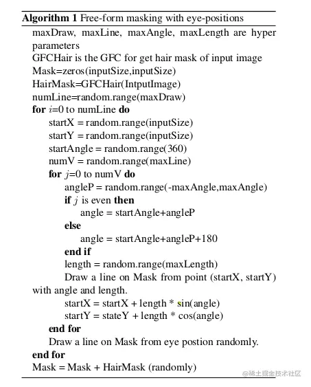 SC-FEGAN主要将眼睛和头发做了掩模处理。训练时,随机将一个眼睛或头发的掩模作为起点,表达被遮盖的部分。具体算法如下: