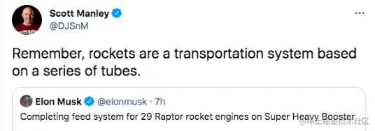 「请记住,火箭是基于一系列管道的运输系统,」他写道。