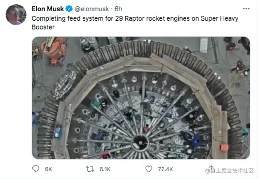 「为超重型助推器上的 29 个猛禽火箭发动机完成进料系统。」马斯克在标题中写道。