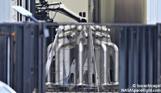 然而,在助推器底部,SpaceX必须设计、制造和组装一个极其拥挤和复杂的机械结构,用来安装和驱动 29 到 33 个猛禽引擎,并为其提供燃油。