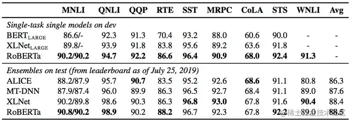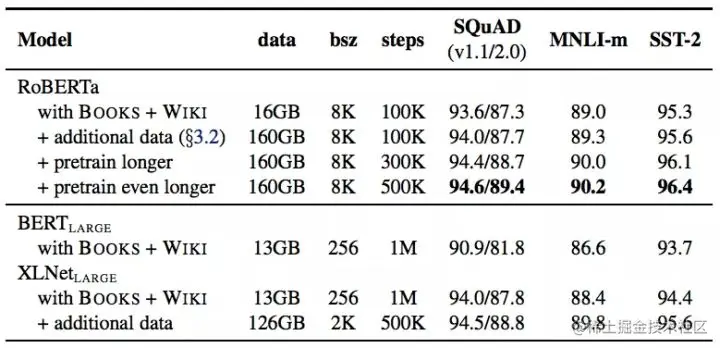 要说 RoBERTa 是如何制霸 3 个 benchmark 排行榜的,简言之,用更多的数据,采取更精妙的训练技巧,训练更久一些。
