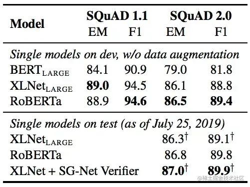 表 6:SQuAD 的结果。+ 表示依赖于额外外部训练数据的结果。RoBERTa 在开发和测试中仅使用了提供的 SQuAD 数据。BERTLARGE 和 XLNetLARGE 结果分别来自 Devlin et al. 和 Yang et al.