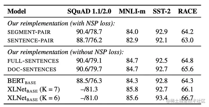 NSP 损失被认为是训练原始 BERT 模型的一个重要因素。Devlin 等人 (2019) 观察到,去除 NSP 会损害性能,QNLI、MNLI 和 SQuAD 的性能都显著下降。然而,最近的一些工作对 NSP 损失的必要性提出了质疑。
