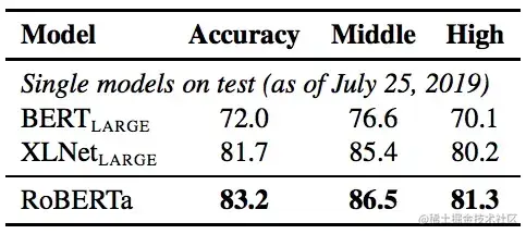 表 7:RACE 测试集的结果。BERTLARGE 和 XLNetLARGE 的结果来自 Yang et al.