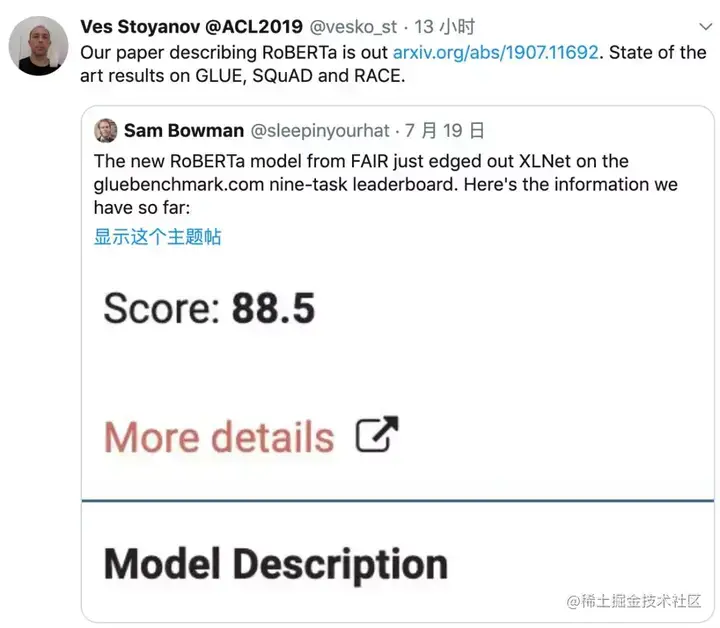 作者之一的 Veselin Stoyanov 在推特上公布了该结果