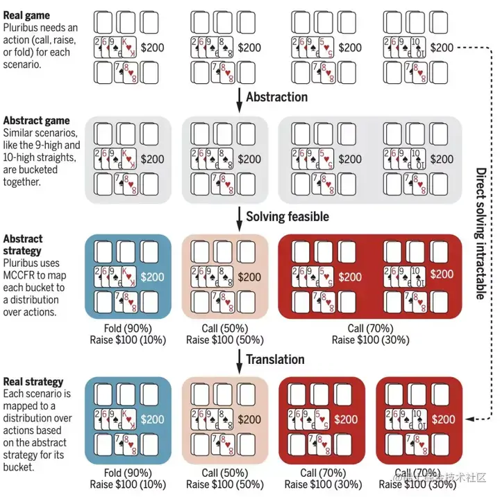 在 Abstraction 机制中,Pluribus 通过将类似的情况打包在一起,减少了关于是否跟注 (call)、加注 (raise) 或弃牌 (fold) 的决策点的数量。使用蒙特卡罗虚拟遗憾最小化 (MCCFR),将扑克游戏中树搜索的复杂性从一个棘手的问题降低到一个可解决的问题。
