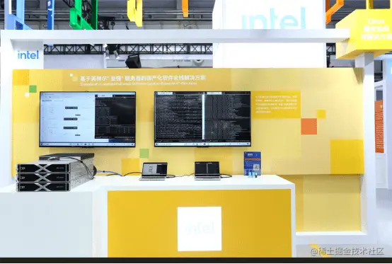 在Linux 操作系统与解决方案展台上,英特尔展示了基于英特尔®至强®服务器的国产化软件全栈解决方案。展台上,通过由 3 台服务器组成的一套超融合环境,部署包括 OpenEuler、OpenAnolis、OpenCloud OS 国产操作系统的 SmartX 超融合软件、Gbase 数据库软件、用友 OCR 实时识别用例和金蝶 NLP 实时处理用例,全面展示了基于英特尔® 至强®服务器支持全栈国产软件应用的能力,为用户提供了最佳的解决方案和服务。