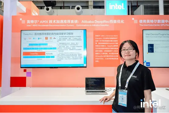 在Alibaba DeepRec 性能优化的演示中,展现了阿里巴巴面向推荐场景的开源高性能深度学习框架。该框架利用英特尔 AMX 技术进行优化,大幅提升了计算性能。除此之外,展台上还提供了使用英特尔数据中心GPU 来加速人工智能模型,与英特尔一起拥抱生成式人工智能,以及从云端到客户端,激发生成式 AI 在 Intel 平台的无限潜能等精彩示例。