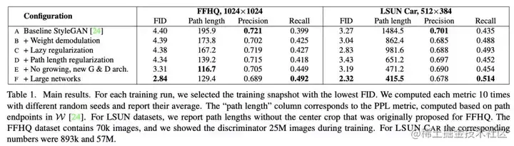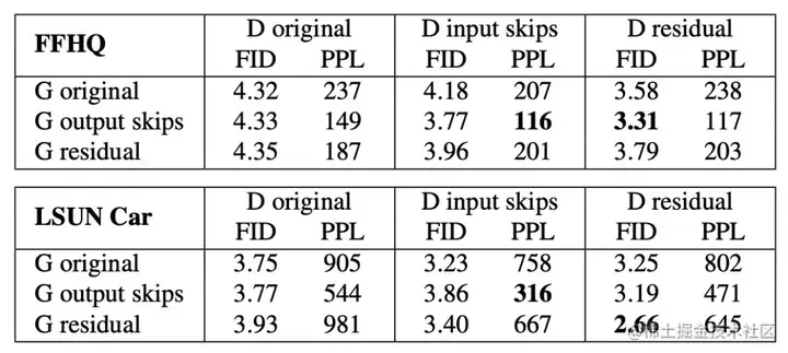 StyleGAN2使用了一个skip generator和一个残差鉴别器,但没有使用progressive growing。这对应于表1中的配置E,从表中可以看出,切换到这种设置显著地改进了FID和PPL。