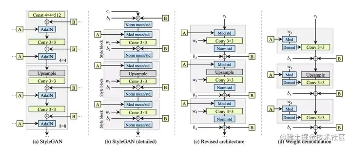 如图2所示,(a)是原始的StyleGAN,其中A表示从W学习的仿射变换,产生了一个style;(b)展示了原始StyleGAN架构的细节。在这里,我们将AdaIN分解为先显式归一化再调制的模式,对每个特征图的均值和标准差进行操作。我们还注释了学习的权重(w)、偏差(b)和常量输入(c),并重新绘制了灰色框,使每个框都激活一个style。激活函数(leaky ReLU)总是在添加偏置后立即应用。如(c)所示,我们对原始架构做了几处改动,包括在开始时删除了一些冗余操作,将b和B的添加移动到style的活动区域之外,并只调整每个feature map的标准差。(d)是修改后的架构,使我们能够用“demodulation”操作代替 instance normalization,我们将demodulation操作应用于与每个卷积层相关的权重。