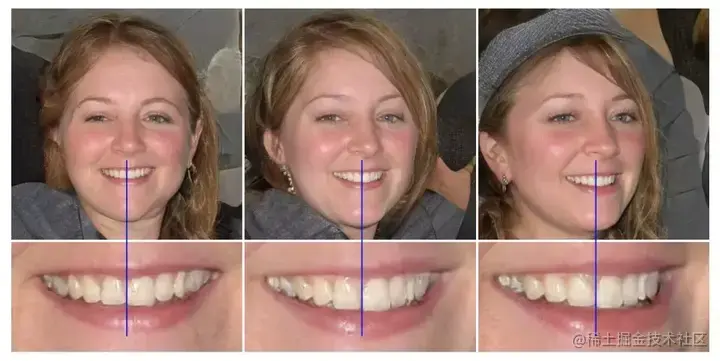 图6:Progressive growing导致了 “phase” artifact。在这个例子中,牙齿没有跟随姿势变化,脸转向了一侧,牙齿仍面向正前方,如蓝线所示。