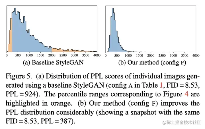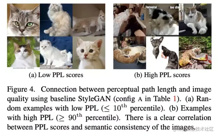 FID和P&R都基于分类器网络,最近的研究表明,分类器网络侧重于纹理而不是形状,因此,这些指标不能准确地代表图像质量的所有方面。我们将感知路径长度(PPL)指标作为一种估计潜在空间插值质量的方法,该指标与形状的一致性和稳定性相关。在此基础上,我们将合成网络正则化,以支持平滑映射,并获得明显的质量改进。为了抵消计算开销,我们还建议减小执行所有正则化的频率,因为这样做不会影响效率。