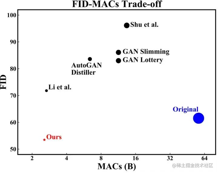并且利用知识蒸馏用搜索过程中训练的大模型指导搜索出的小模型的训练过程,在远低于原始超大规模生成模型计算量的条件下实现优于原始超大规模生成模型的生成图片质量。