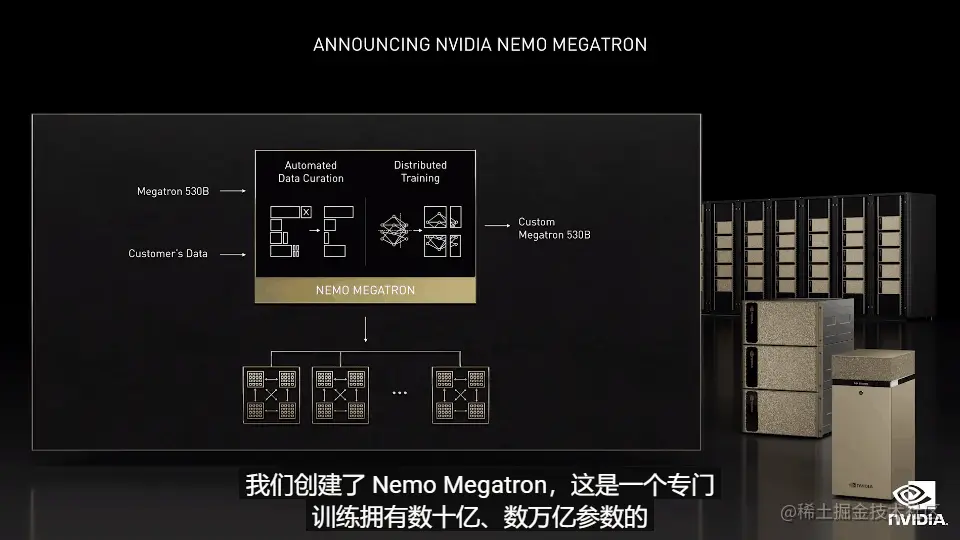 NVIDIA 今天还打开了开发和部署大型语言模型 (LLM) 的大门,推出了用于训练具有数万亿个参数的语言模型的NVIDIA NeMo Megatron框架、可针对新领域和语言进行训练的Megatron 530亿参数的可定制大型语言模型,以及具有多 GPU、多节点分布式推理功能的NVIDIA Triton推理服务器。