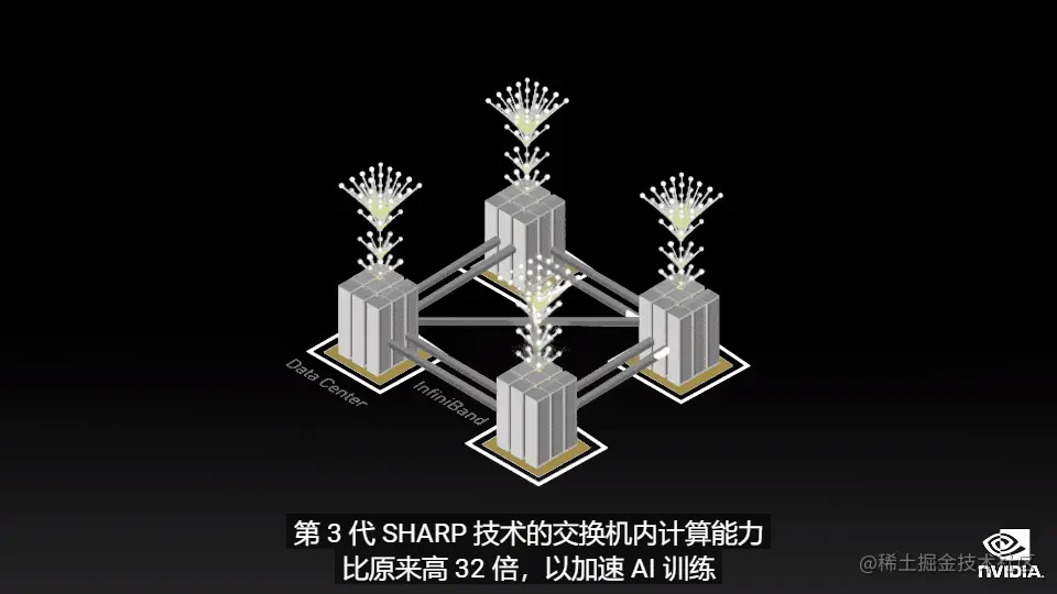 与上一代技术相比,NVIDIA Quantum-2 SHARPv3网络计算技术为AI应用程序提供了32倍的加速引擎。