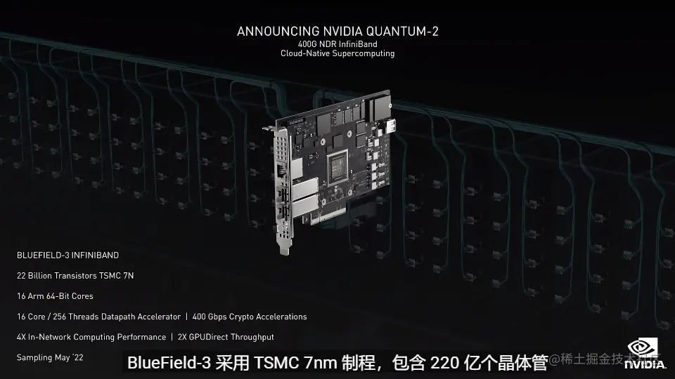Quantum-2平台的核心是新的Quantum-2 InfiniBand交换机。它搭载570亿个晶体管,比拥有540亿个晶体管的NVIDIA A100 GPU略大。