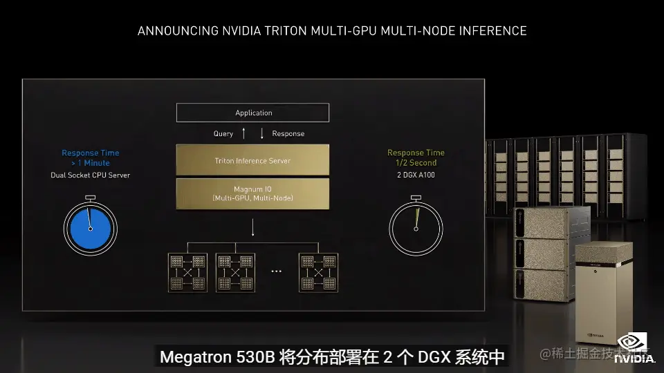 使用Triton推理服务器,Megatron 530B可以在两个NVIDIA DGX系统上运行,将CPU服务器上的处理时间从一分钟多缩短到0.5秒,从而实现在应用程序上快速、实时地部署大型语言模型。