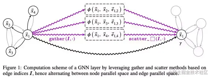 在实践中,这可以通过收集和散布节点特性并利用 broadcasting 进行 和