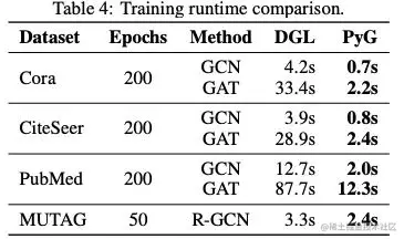 我们对多个数据模型对进行了多次实验,并报告了在单个 NVIDIA GTX 1080 Ti 上获得的整个训练过程的运行情况 (表 4)。与 Deep Graph Library (DGL)(Wang et al., 2018a) 相比,PyG 训练模型的速度快了 15 倍。