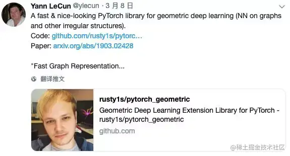 Yann Lecun 也热情推荐了这个工作,称赞它是一个快速、美观的 PyTorch 库,用于几何深度学习 (图和其他不规则结构的神经网络)。