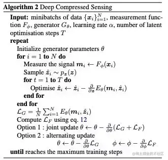 下面的算法 2 总结了这个扩展算法。我们称之为深度压缩感知 (DCS) ,以强调测量和重建可以是深度神经网络。