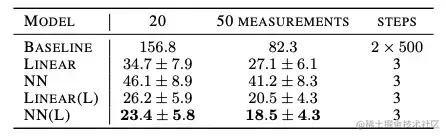 表 2:使用不同测量函数的 MNIST 测试数据的重建损失。除了第一行之外,所有行都来自我们的模型。“±” 表示测试样本间的标准差。(L) 表示习得的测量函数,越低越好。