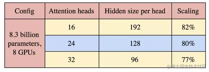 最后,我们研究了 attention heads 对模型并行扩展的影响。为此,我们考虑了 83 亿参数、具有 8 路模型并行性的参数配置,并将 attention heads 的数目从 16 个改为 32 个。结果如表 2 所示。随着 attention heads 数量的增加,self attention 层中的一些 GEMM 变小,同时 softmax 中的元素数量增加。这导致了轻微的 scaling decrease。未来的研究在设计大型 transformer 模型时应该警惕这种超参数,平衡模型性能和模型效率。
