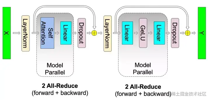transformer 层由一个self attention block和一个 2 层的多层感知器 (MLP) 组成。我们分别在这两个模块中引入模型并行性。