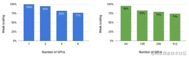 图 4:模型 (左) 和模型 + 数据 (右) 随着 GPU 的数量并行地进行 weak scaling。