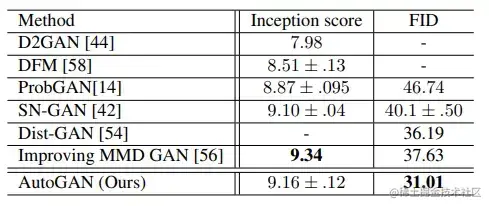 表 2:STL-10 上无条件图像生成的初始分数和 FID 分数。AutoGAN 在 CIFAR-10 上使用发现的体系结构