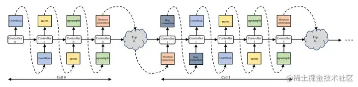 - 定义搜索空间以捕获 GAN 架构变化。最重要的是,使用 RNN 控制器来指导架构搜索。基于参数共享策略,在搜索过程中进一步引入了参数动态重置策略,以提高训练速度。