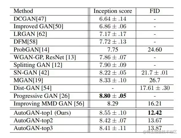 - 在基于强化学习的 AutoGAN 优化中,使用 Inception score(IS)作为奖励。发现的模型在其他 GAN 指标下也表现出良好的性能,例如 Fréchet Inception Distance(FID)。