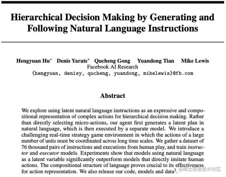 摘要:我们探索使用潜在的自然语言指令作为复杂行为的表达和组合表示,用于分层决策。我们的代理不是直接选择微动作,而是首先用自然语言生成潜在计划,然后由单独的模型执行。我们介绍了一个具有挑战性的实时战略游戏环境,其中大量单位的行动必须在长时间范围内协调。我们从人类游戏中收集了 76000 对指令和执行的数据集,并训练 instructor 和执行者模型。 实验表明,使用自然语言作为潜变量的模型明显优于直接模仿人类行为的模型。语言的组成结构证明了其对行动表征的有效性至关重要。我们还发布了代码,模型和数据。