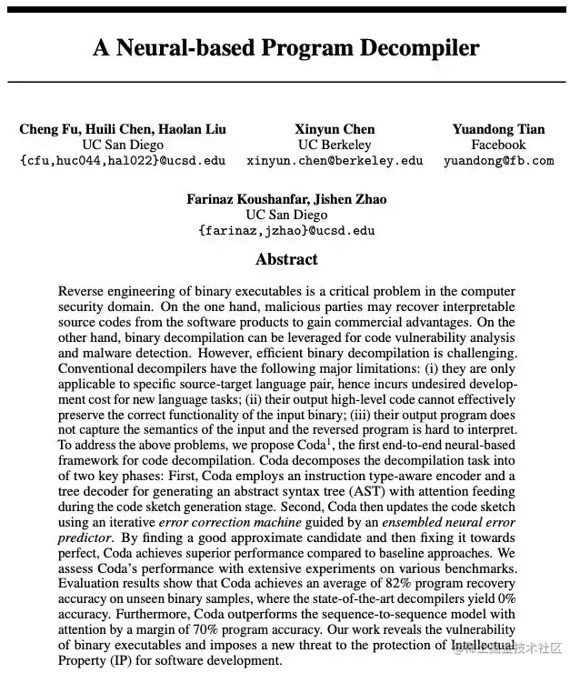 摘要: 二进制可执行文件的逆向工程是计算机安全域中的关键问题。一方面,恶意方可以从软件产品中恢复可解释的源代码以获得商业优势。另一方面,二进制反编译可用于代码漏洞分析和恶意软件检测。但是,有效的二进制反编译具有挑战性。传统的反编译器具有以下主要限制:(i)它们仅适用于特定的源 - 目标语言对,因此导致新语言任务的不期望的开发成本;(ii)它们的输出高级代码不能有效地保留输入二进制的正确功能;(iii)他们的输出程序没有捕获输入的语义,反向程序很难解释。为了解决上述问题,我们提出了 Coda,这是第一个基于端到端神经的代码反编译框架。 Coda 将反编译任务分解为两个关键阶段:首先,Coda 使用指令类型感知编码器和树解码器,用于在代码草图生成阶段期间通过注意馈送生成抽象语法树(AST)。其次,Coda 然后使用由整体神经误差预测器引导的迭代纠错机更新代码草图。通过找到一个好的近似候选者,然后将其修复为完美,与基线方法相比,Coda 实现了卓越的性能。我们通过各种基准测试的广泛实验来评估 Coda 的性能。评估结果表明,Coda 在看不见的二进制样本上实现了平均 82%的程序恢复精度,其中最先进的反编译器产生 0%的准确度。此外,Coda 优于序列到序列模型,并且具有 70%的程序精度。