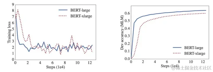 我们还观察到,简单滴增加模型的 hidden size 可能会导致性能下降,比如 BERT-large。表 1 和图 1 给出了一个典型的例子,我们简单地将这个 BERT-xlarge 模型的 hidden size 增加到 2 倍,结果却很糟糕。