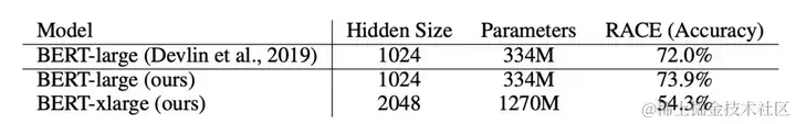 表 1:在 RACE 测试中,增加 BERT-large 的 hidden size 导致模型性能下降。