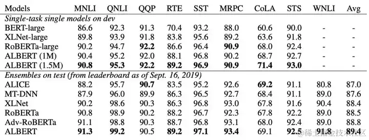 基于这些设计,ALBERT 能够扩展到更大的版本,参数量仍然比 BERT-large 少,但是性能明显更好。