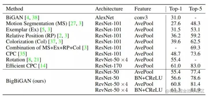 表 2:在官方 ImageNet 验证集上对 BigBiGAN 模型与最近的基于监督式逻辑回归分类器的其他方法的对比。