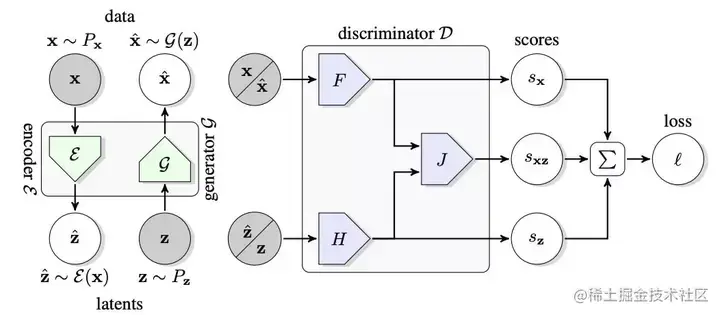 作为 GAN 框架的扩展,Vincent Dumoulin 等人 (ICLR 2017) 提出 adversarially learned inference(ALI) [7],或 Jeff Donahue 等人 (ICLR 2017) 提出 bidirectional GAN (BiGAN) [4] 方法,这些方法通过编码器模块将实际数据映射到潜在数据 (与生成器学习的映射相反) 来增强标准 GAN。