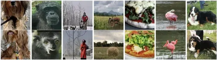 图 2:从无监督的 BigBiGAN 模型中选择的图像重建结果。上面一行的图像是真实图像(x~Px),下面一行图像是由 G(E(x))计算出的这些图像的重建结果。与大多数显式重建成本(例如像素数量)不同,由(Big)BiGAN 实现隐式最小化的重建成本更多倾向于强调图像的语义及其他更高级的细节。