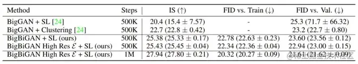 表 3 所示为 BigBiGAN 进行无监督生成的结果,与基于 BigGAN 的无监督生成结果做比较。请注意,这些结果与表 1 中的结果不同,因为使用的是数据增强方法(而非表 1 中的用于所有结果的 ResNet 样式预处理方法)。
