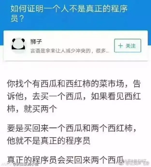 你找个有西瓜和西红柿的菜市场,告诉他,去买一个西瓜,如果看见西红柿,就买两个要是买回来一个西瓜和两个西红柿,他就不是真正的程序员真正的程序员会买回来两个西瓜